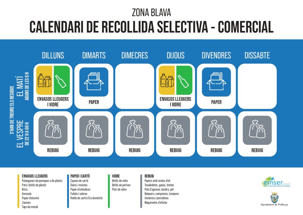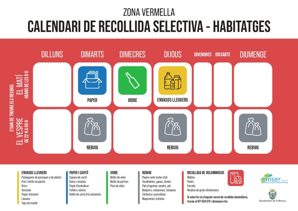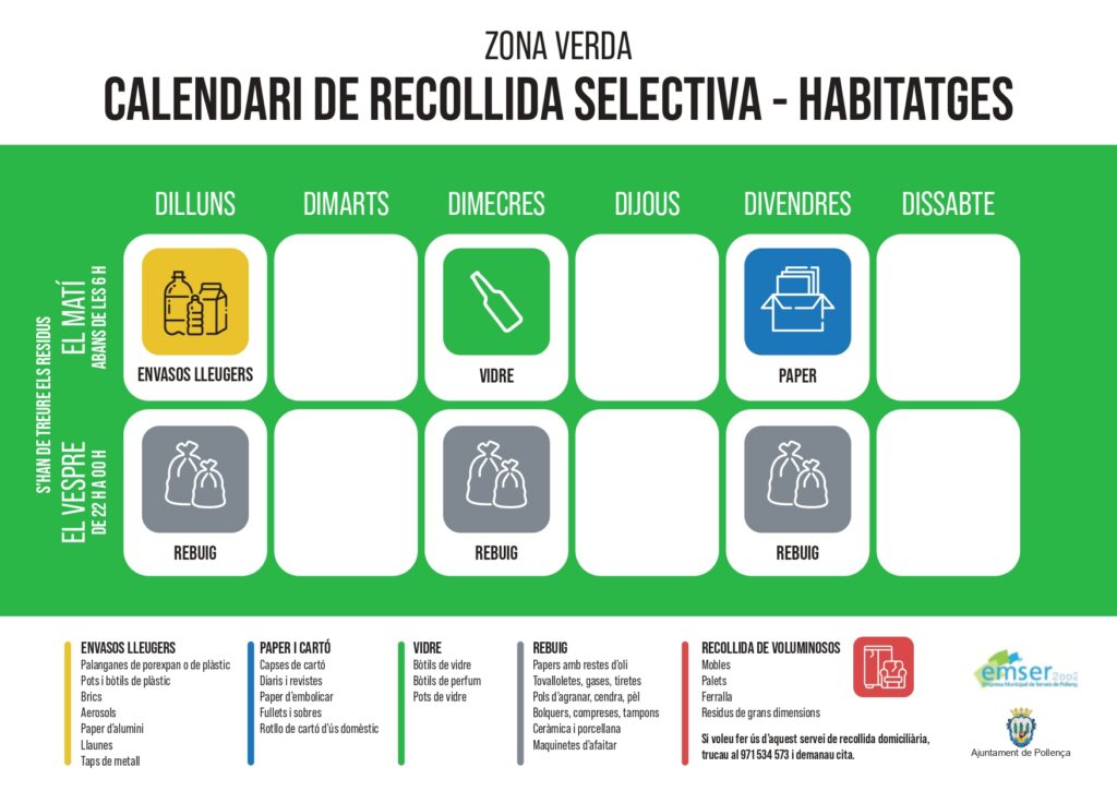 EMSER realitza la recollida porta a porta de les fraccions resta, paper, vidre i envasos en la major part del nucli urbà de Pollença.
