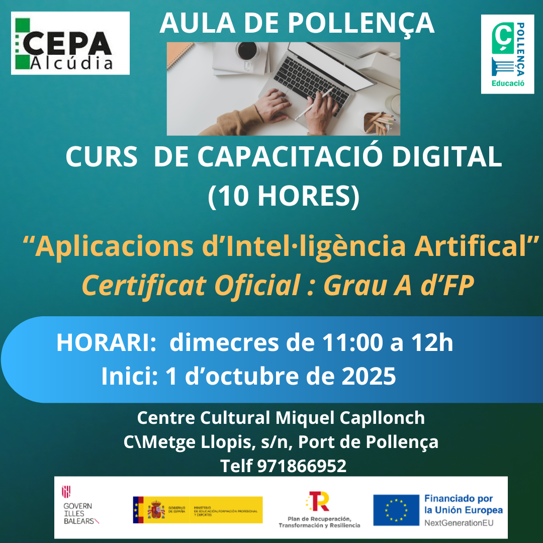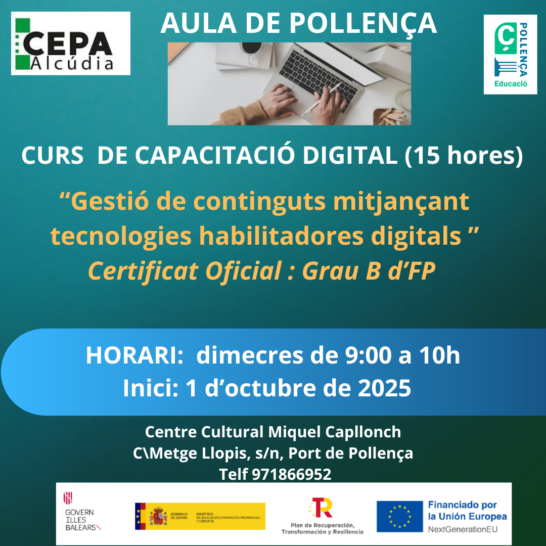 ‼️ Dia 1 d'octubre, començen els cursos de capacitació digital al Centre Miquel Capllonch (Port de Pollença).