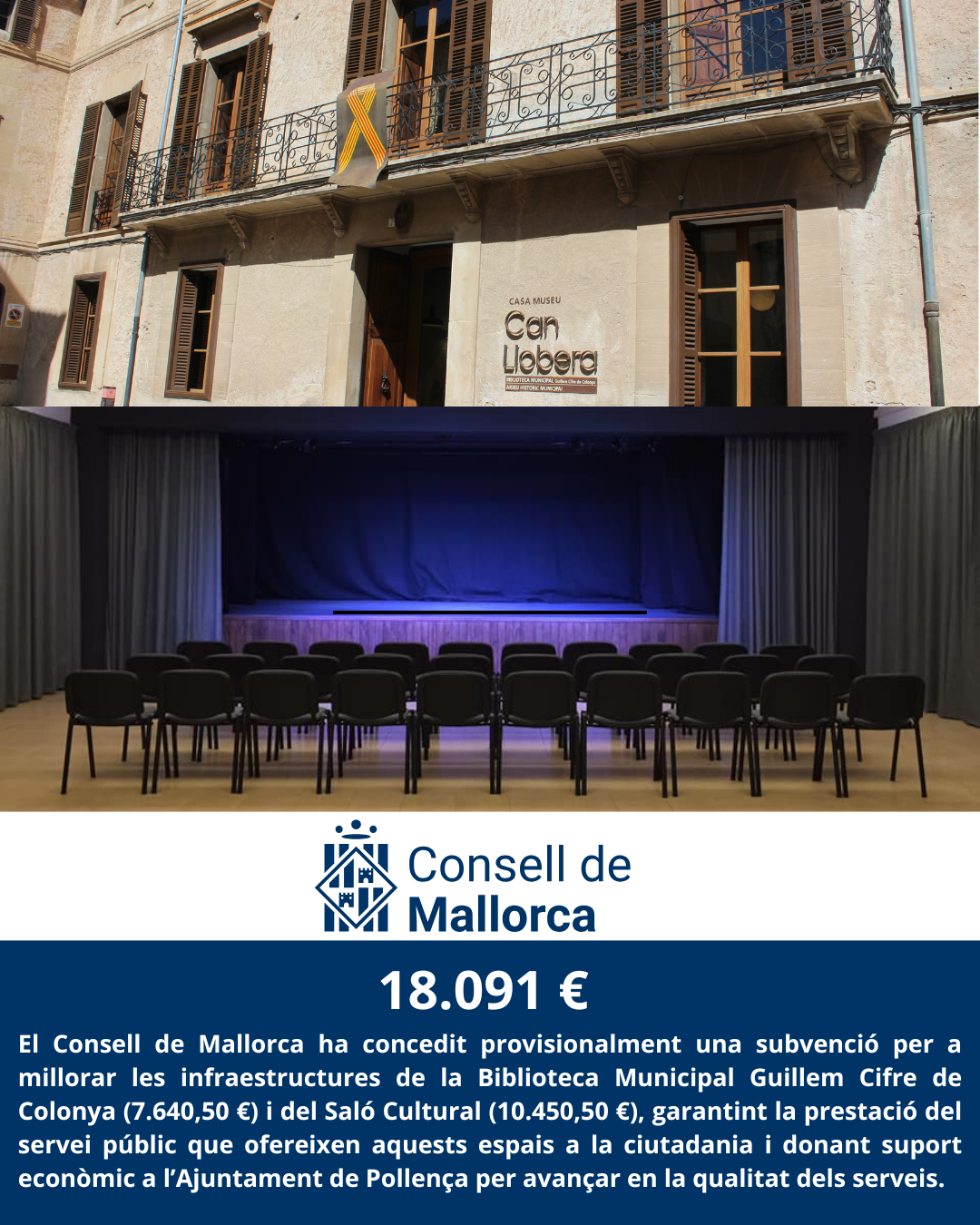 El Consell de Mallorca ha concedit provisionalment 18.091 € a les Àrees de Biblioteques i de Cultura de l'Ajuntament de Pollença dins el marc de la Convocatòria de subvencions 2025 d'inversions municipals per a equipaments culturals i Festes d'interès culturals. Aquesta subvenció servirà per a millorar les infraestructures de la Biblioteca Municipal Guillem Cifre de Colonya (7.640,50 €) i del Saló Cultural (10.450,50 €), garantint la prestació del servei públic que ofereixen aquests espais a la ciutadania i donant suport econòmic a l’Ajuntament de Pollença per avançar en la qualitat dels serveis.